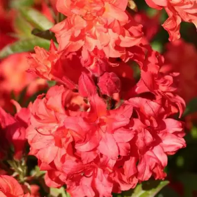 Азалия Фойеркопфен — это не просто декоративное растение, а настоящая живописная палитра. Каждое цветение — это праздник для глаз: слабо душистые красные цветки, собранные в очаровательные круглые соцветия, создают непревзойденный контраст на фоне зелени. Соцветия достигают впечатляющего диаметра до 14 см, а размер отдельных цветков может составлять до 6,6 см. Каждое растение удивляет своими «полными» цветками, где преобразовавшиеся тычинки образуют дополнительные «лепестки», придавая им особую пышность.