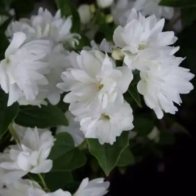 Фрости Мон - кустарник до 1,5 м высотой, диаметром до 1 м. Изначально крона вертикально-направленная, с возрастом более ассиметричная, поникающая. Цветет в июне-июле. Цветки белые, махровые, диаметром до 4 см, с приятным сладким ароматом.