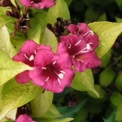 Листья растения ярко-жёлтого цвета с матовой поверхностью и слегка заострённой формой отлично контрастируют с насыщенными рубиново-красными бутонами. Цветение вейгелы начинается в мае и длится до июня, с повторным цветением в августе-сентябре, что создает обильное и пышное зрелище. Соцветия щитковидной формы, состоящие до 5 крупных трубчатых цветков, наполняют сад насыщенным ароматом. Особенностью Бриан рубидор является его способность цвести многократно, обеспечивая продолжительное цветение и радость для глаз.