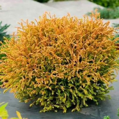 Растение образовано двусторонними сплюснутыми ветками и короткими, тонкими, довольно гибкими, повисающими побегами. Чешуйчатая хвоя кустарника не прижата к ветвям, состоит из иголок и выглядит невероятно ажурной. Привлекательность ей также придает золотисто-желтый цвет. Однако у основания хвоя культуры светло-зеленая. Постепенно концы тонких иголок приобретают яркий желто-оранжевый оттенок, переходящий с наступлением зимы в цвет темной бронзы. Хвойные чешуйки покрыты тонким восковым налетом и снабжены железками с эфирным маслом, богатым фитонцидами. Голден Таффет — медленнорастущая культура. В год она прибавляет в размерах не более 12 см. По данной причине в 10-летнем возрасте диаметр хвойника равен 50 см. Растение же, отметившее свой 25-тилетний юбилей, достигает 90 см в высоту и чуть больше метра в ширину. Веточки молодых туй покрыты гладкой, красно-бурой корой, которая по мере их взросления становится серо-коричневой. Период плодоношения золотистой красавицы, начинающийся в 10 лет, характеризуется появлением на ней мелких шишек длиной около 8 мм. Это очень теневыносливый и зимостойкий сорт, выдерживающий морозы до -34ºС. Сорт Голден Таффет — незаменимый элемент дизайна сада и цветника. Он используется в качестве одиночной культуры на фоне травянистого газона; для оформления живых изгородей, аллей, бордюров, для декорирования склонов. Уместен подушковидный хвойник на круглой клумбе. В этом случае превосходными компаньонами для него послужат пионы, розы, ирисы, лилейники, душистые цветущие травы. Вокруг растения можно высадить почвопокровные культуры, одно- и многолетники с мелкими цветочками. Особенно привлекательно по соседству с кустарником будут смотреться обладатели желтых, ярко-красных, сиреневых, голубых и фиолетовых соцветий.