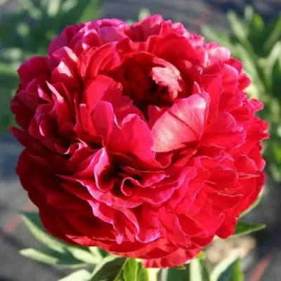 Цветки представляют собой крупные, махровые образования розовидной и шаровидной формы. Диаметра до 20 см, они поражают своей темно-красной насыщенной окраской, блестящей структурой лепестков и атласным блеском. Лепестки жесткие, упругие, широкие и плотно прилегающие друг к другу, создавая впечатление плотного и блестящего шара. Обладая приятным ароматом, они привнесут в ваш сад непередаваемое ощущение благородства и великолепия.