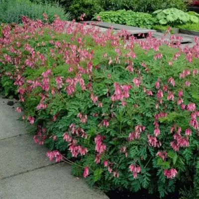 Главная особенность дицентры изящной — уникальные цветки в форме миниатюрных сердечек. Они собраны в изогнутые кисти длиной до 15 см. Оттенки — от лососево-розовых до насыщенно пурпурных. Цветение продолжается с конца мая до середины августа, а при благоприятных условиях — до сентября. Аромат отсутствует, зато визуальный эффект — выразительный и долгий.