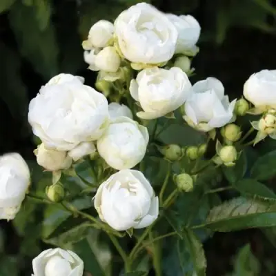 Цветы розы Уайт Морсдаг имеют очаровательную молочно-белую окраску, с белым основным цветом. Форма цветка практически правильная, шаровидная, что придает ему сходство с нераспустившимися бутонами пиона. Размер цветка невелик - около 4 см в диаметре. Цветок классифицируется как полумахровый, и на нем можно увидеть от 9 до 16 лепестков. Цветки расположены в соцветиях, и на одном стебле обычно находится от 5 до 10 цветков.